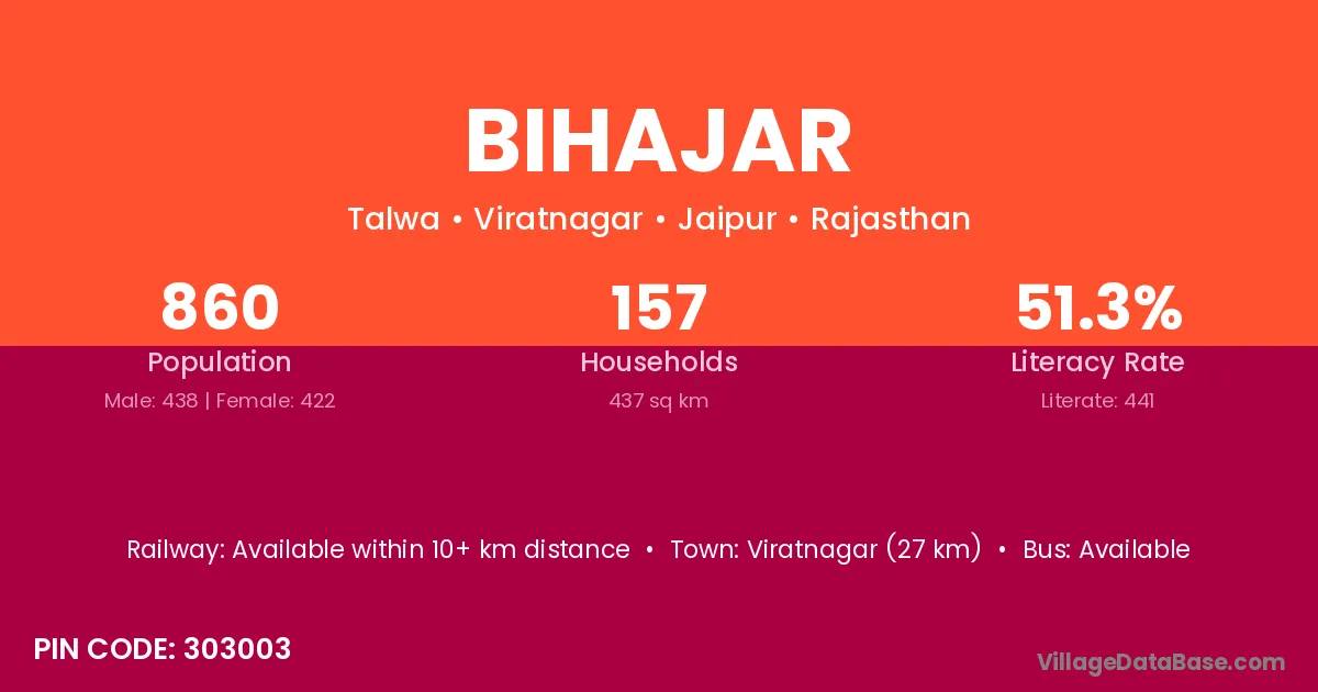 Viratnagar (27 km) is the nearest town to Bihajar village for major economic activities and is located approximately 27 km away.