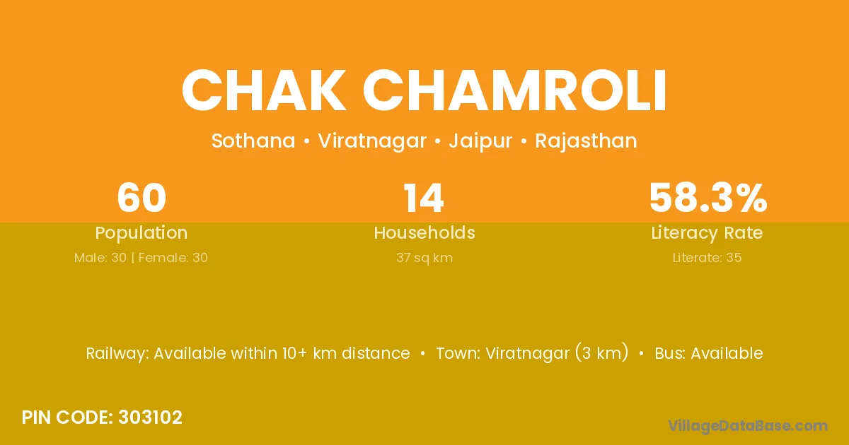 Chak Chamroli village has a total population of 60 people, of which 30 are males and 30 are females.