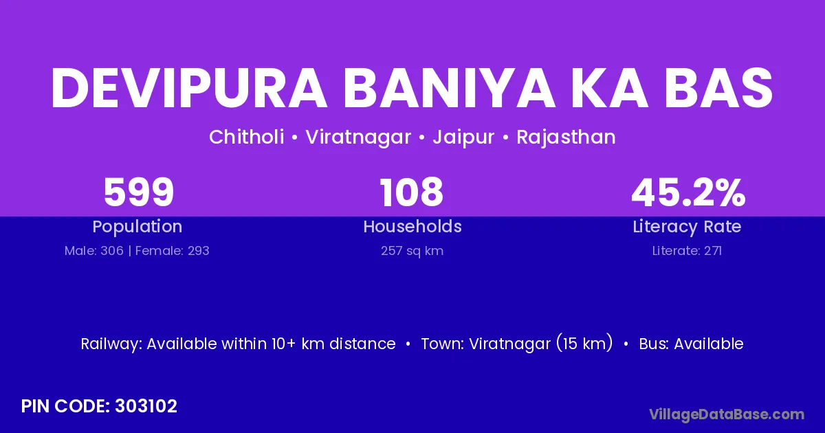 Devipura Baniya Ka Bas village has a total population of 599 people, of which 306 are males and 293 are females.