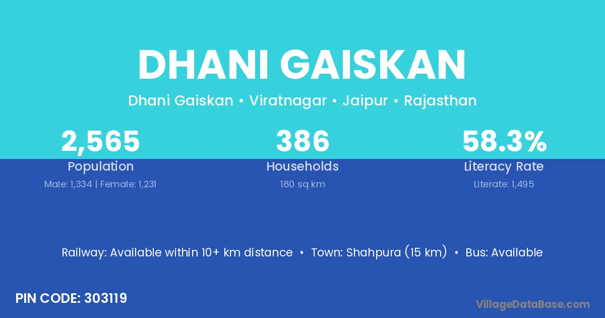 Shahpura (15 km) is the nearest town to Dhani Gaiskan village for major economic activities and is located approximately 15 km away.