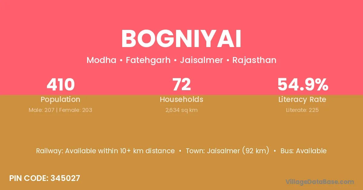Jaisalmer (92 km) is the nearest town to Bogniyai village for major economic activities and is located approximately 92 km away.