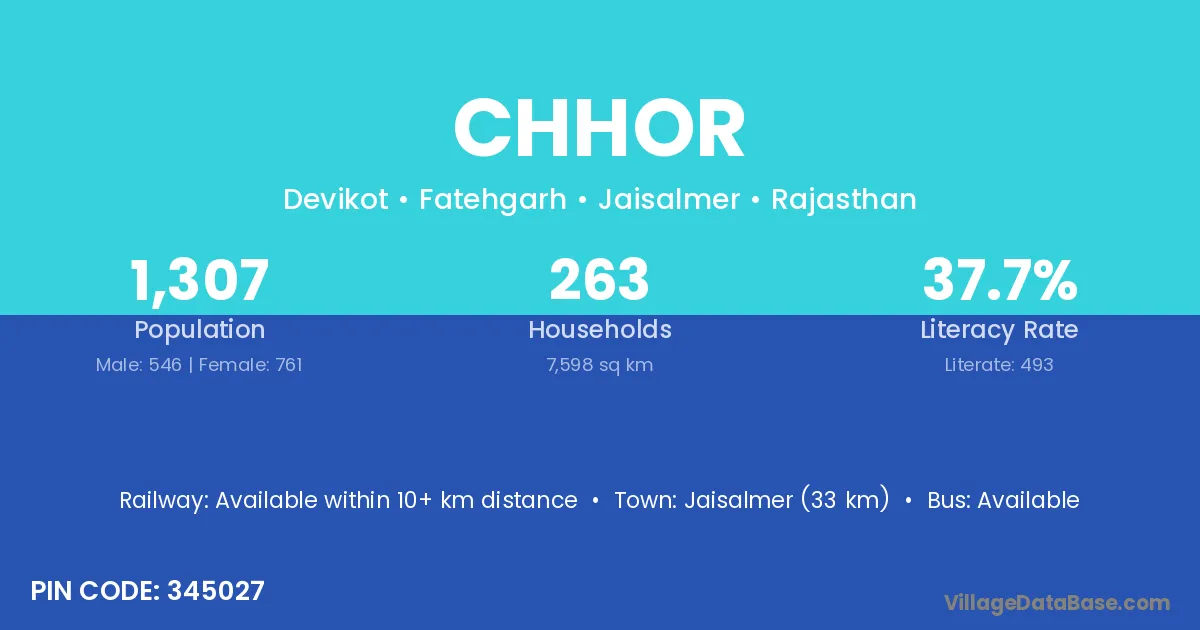 Jaisalmer (33 km) is the nearest town to Chhor village for major economic activities and is located approximately 33 km away.