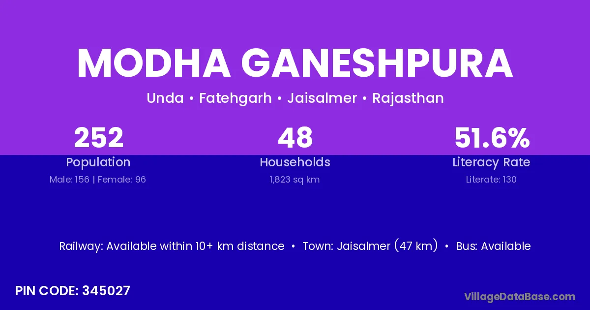 Jaisalmer (47 km) is the nearest town to Modha Ganeshpura village for major economic activities and is located approximately 47 km away.