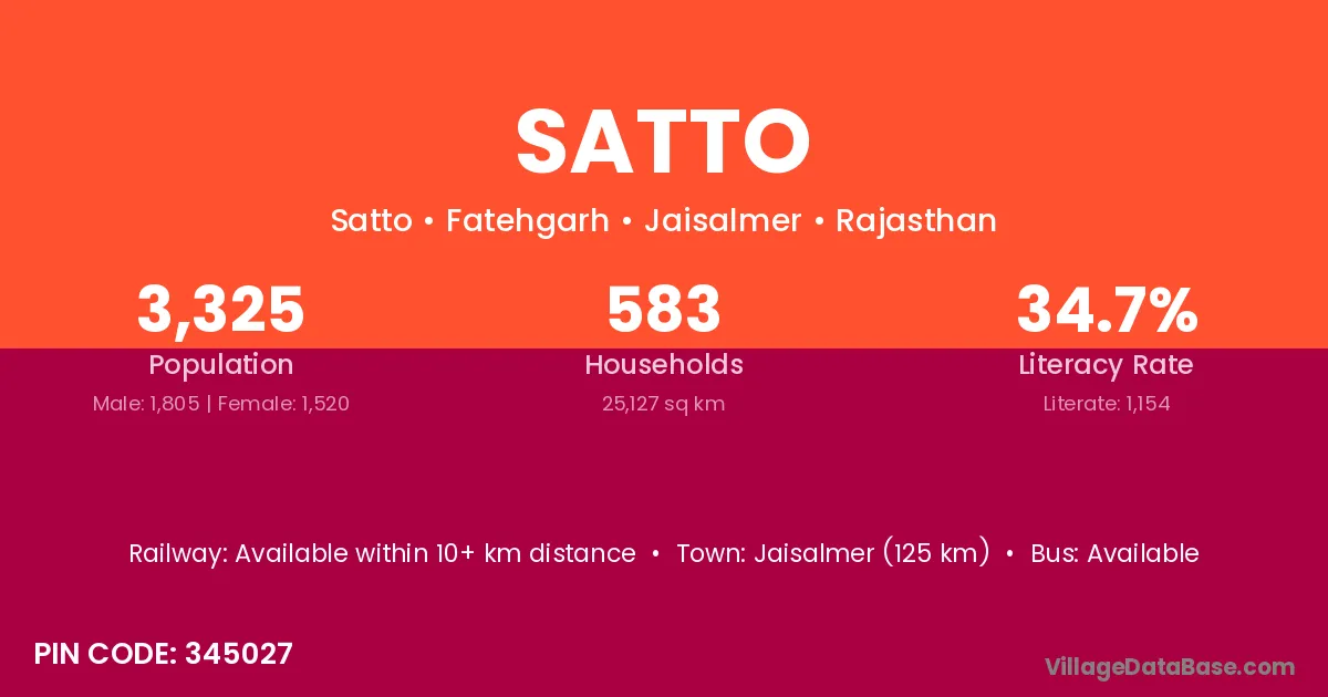 Jaisalmer (125 km) is the nearest town to Satto village for major economic activities and is located approximately 125 km away.