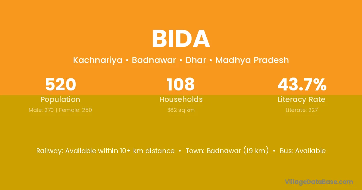 According to Census 2011 information, the village code of Bida village is 345001.