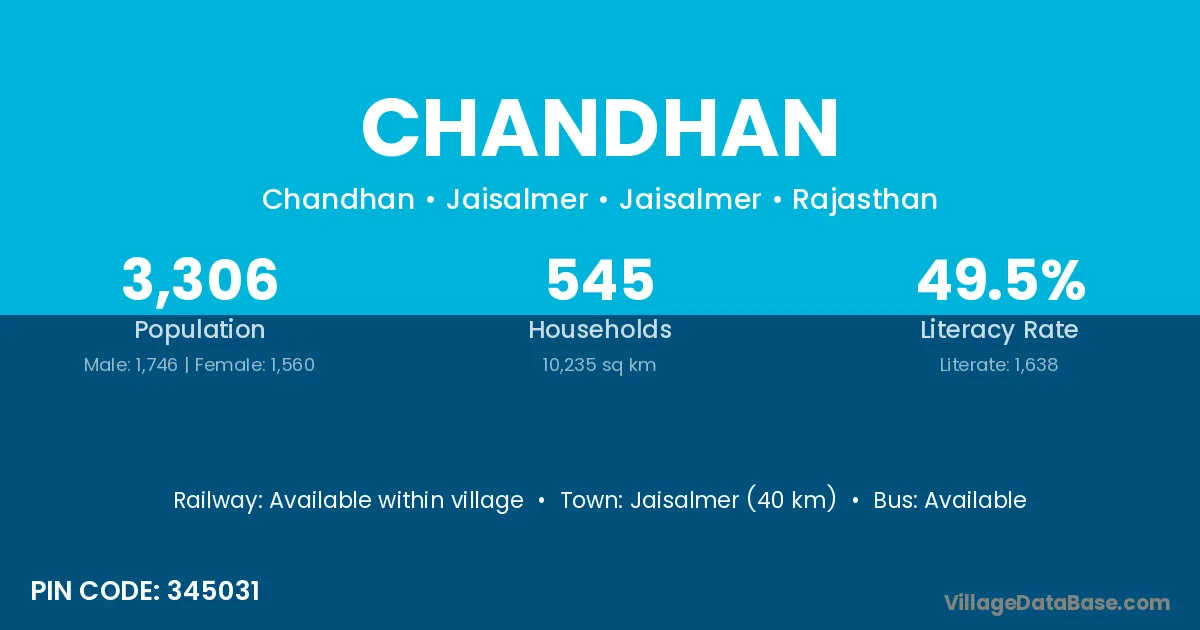 Jaisalmer (40 km) is the nearest town to Chandhan village for major economic activities and is located approximately 40 km away.