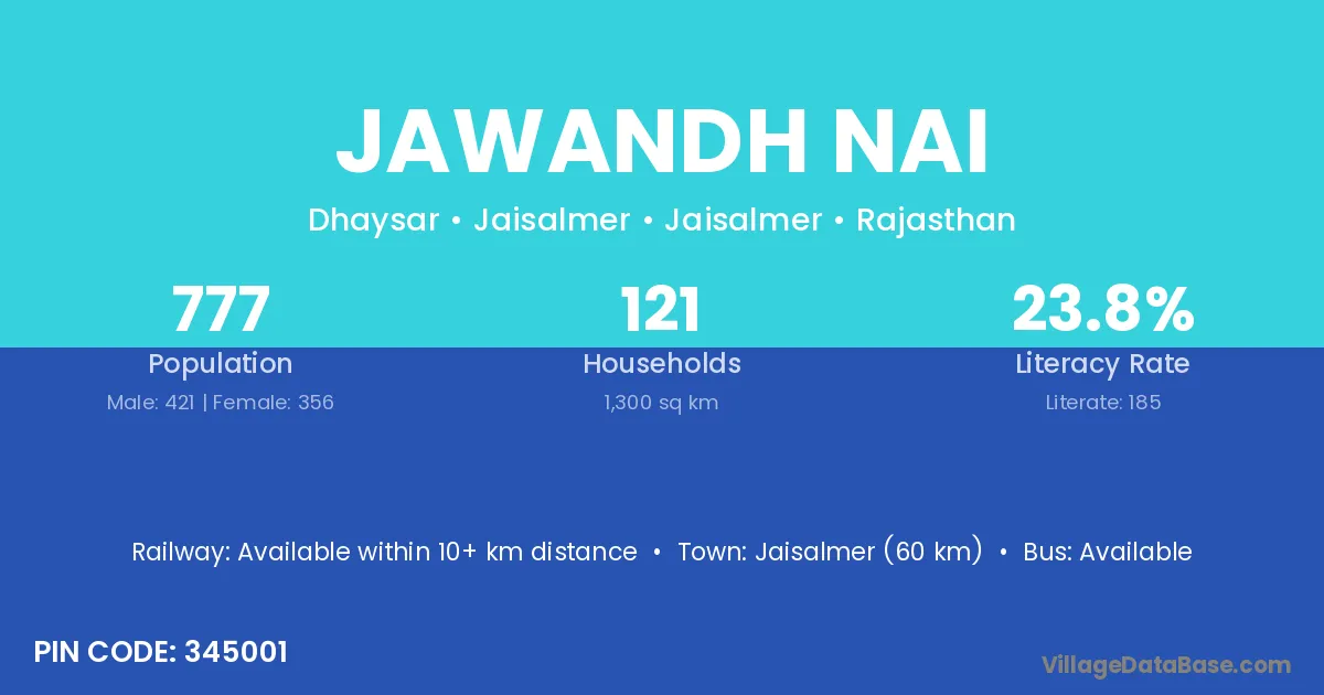 Jaisalmer (60 km) is the nearest town to Jawandh Nai village for major economic activities and is located approximately 60 km away.