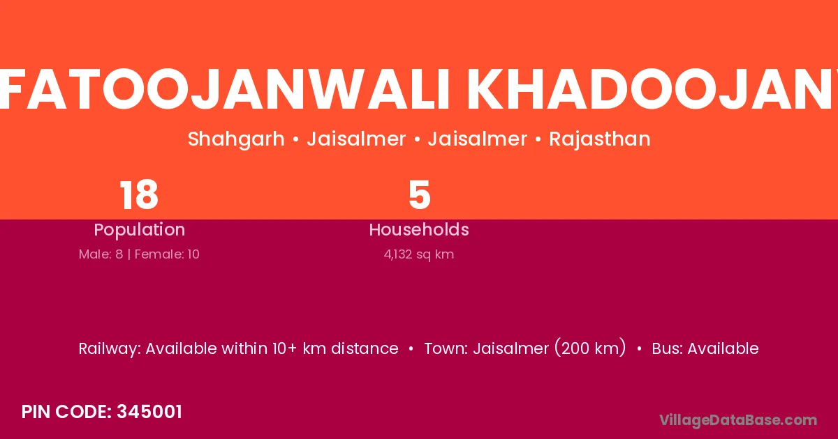 Jaisalmer (200 km) is the nearest town to Khuifatoojanwali Khadoojanwali village for major economic activities and is located approximately 200 km away.