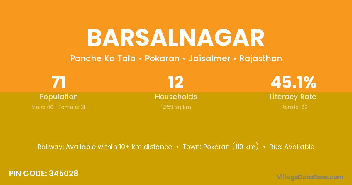 Pokaran (110 km) is the nearest town to Barsalnagar village for major economic activities and is located approximately 110 km away.