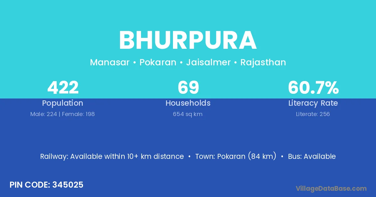 Pokaran (84 km) is the nearest town to Bhurpura village for major economic activities and is located approximately 84 km away.