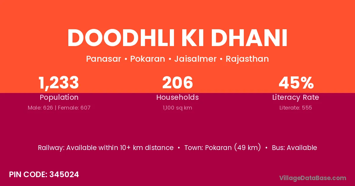 Pokaran (49 km) is the nearest town to Doodhli Ki Dhani village for major economic activities and is located approximately 49 km away.