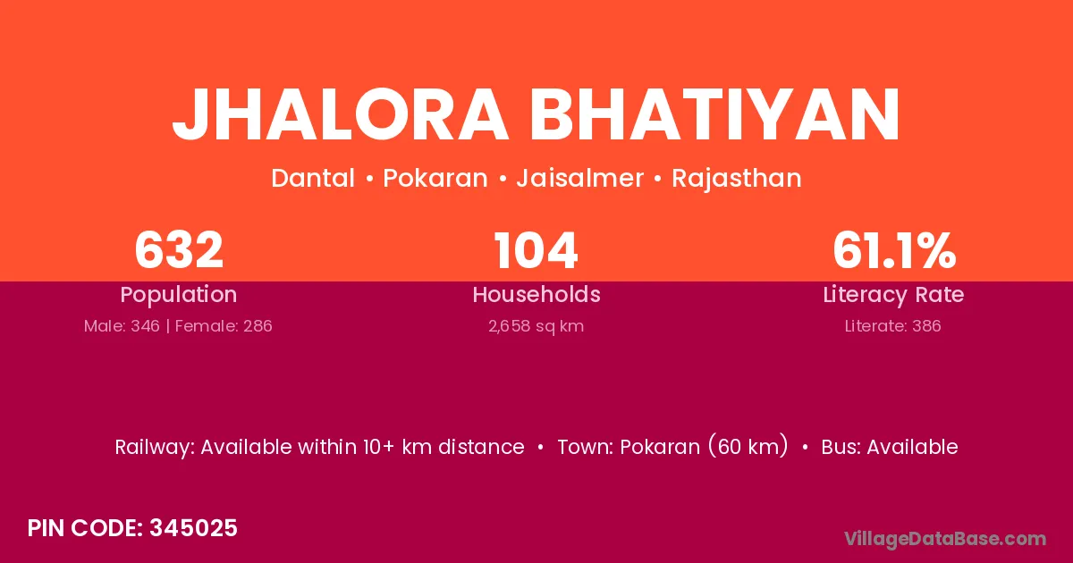 Pokaran (60 km) is the nearest town to Jhalora Bhatiyan village for major economic activities and is located approximately 60 km away.