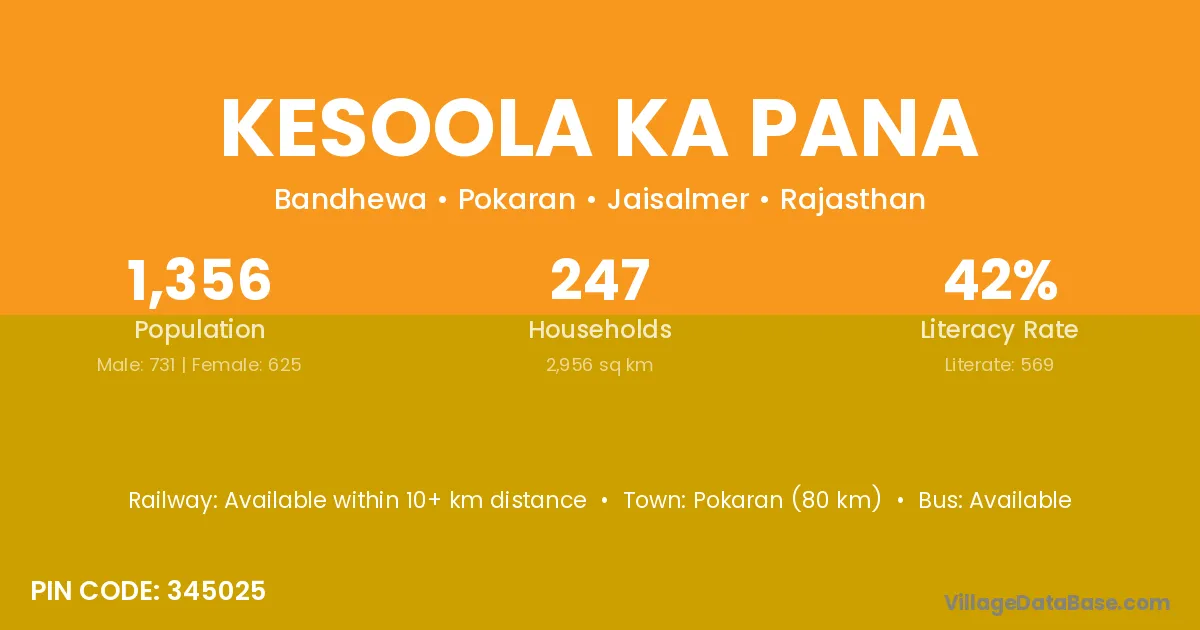 Pokaran (80 km) is the nearest town to Kesoola Ka Pana village for major economic activities and is located approximately 80 km away.