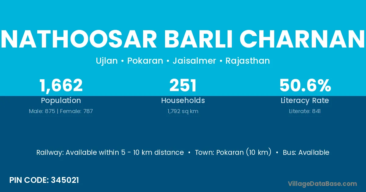 Pokaran (10 km) is the nearest town to Nathoosar Barli Charnan village for major economic activities and is located approximately 10 km away.
