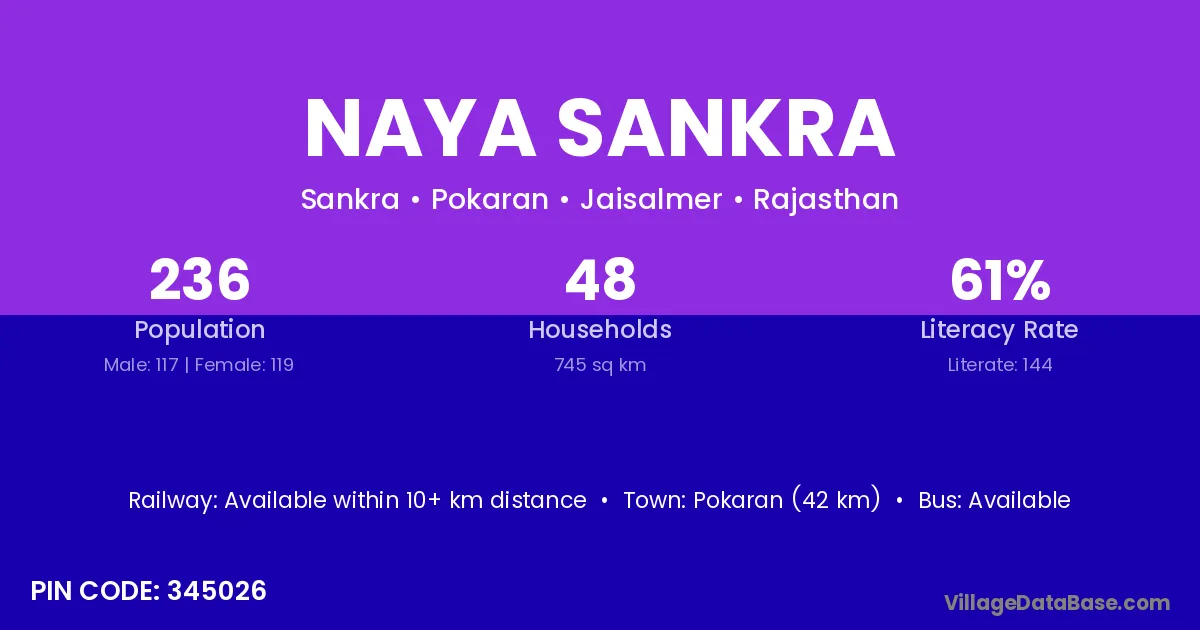 Pokaran (42 km) is the nearest town to Naya Sankra village for major economic activities and is located approximately 42 km away.