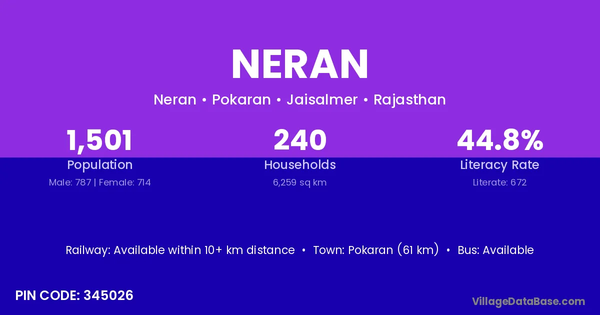 Pokaran (61 km) is the nearest town to Neran village for major economic activities and is located approximately 61 km away.