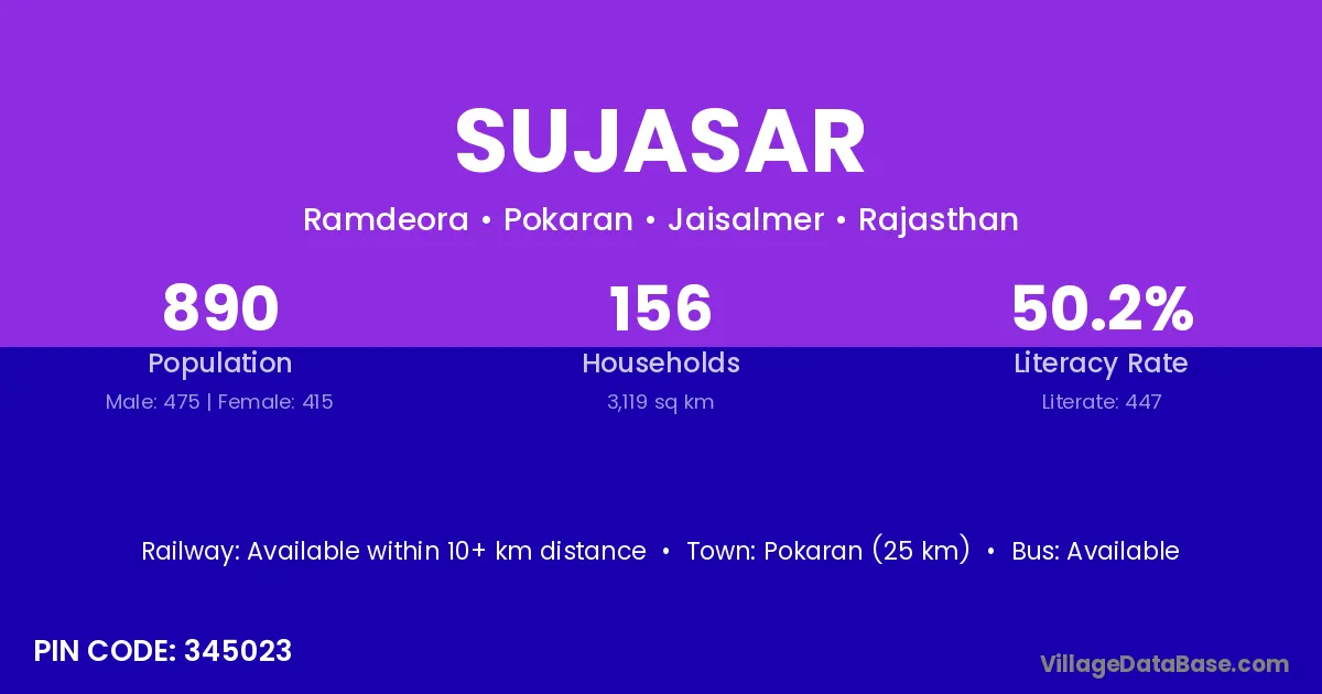 Pokaran (25 km) is the nearest town to Sujasar village for major economic activities and is located approximately 25 km away.