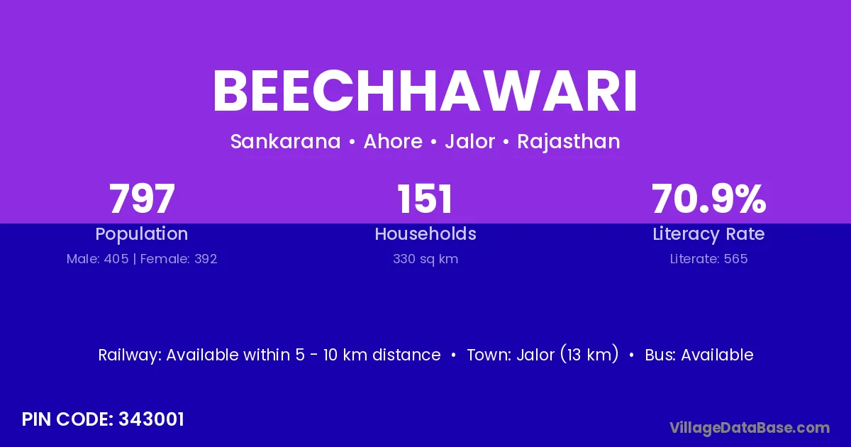 Jalor (13 km) is the nearest town to Beechhawari village for major economic activities and is located approximately 13 km away.
