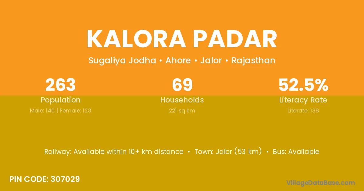 Jalor (53 km) is the nearest town to Kalora Padar village for major economic activities and is located approximately 53 km away.
