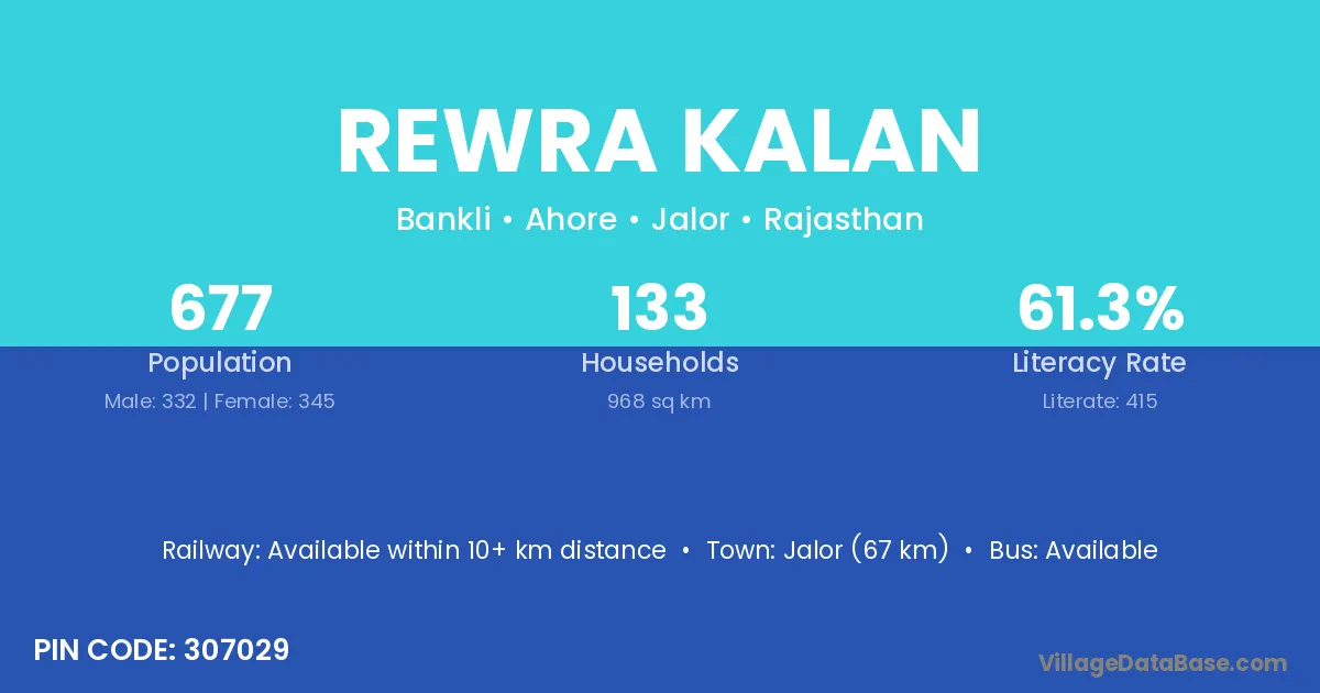 Jalor (67 km) is the nearest town to Rewra Kalan village for major economic activities and is located approximately 67 km away.