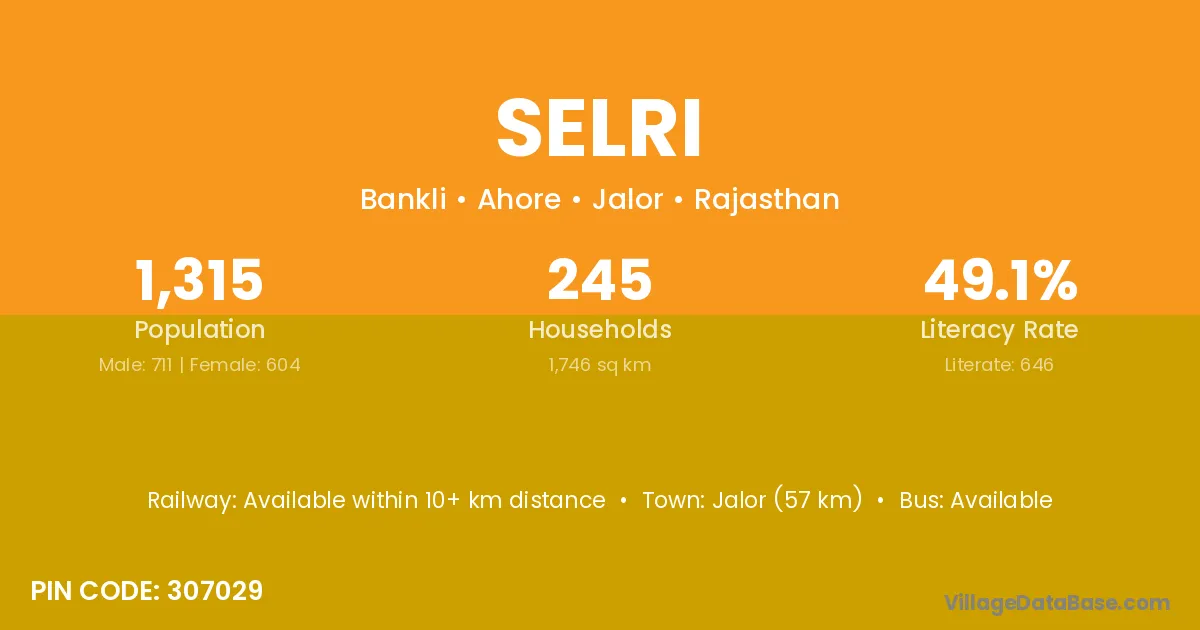 Jalor (57 km) is the nearest town to Selri village for major economic activities and is located approximately 57 km away.