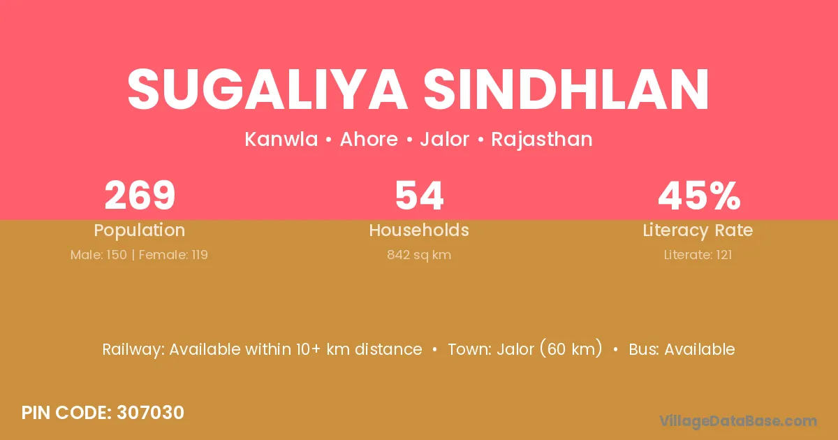 Jalor (60 km) is the nearest town to Sugaliya Sindhlan village for major economic activities and is located approximately 60 km away.