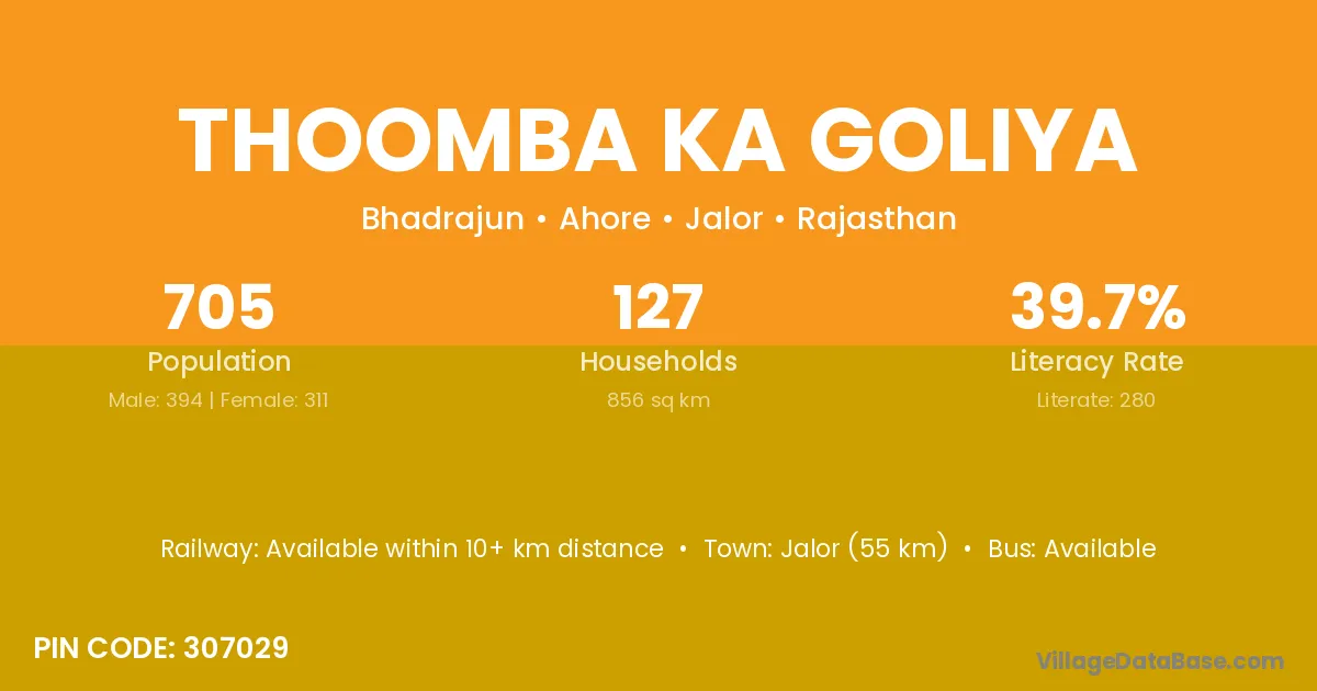 Jalor (55 km) is the nearest town to Thoomba Ka Goliya village for major economic activities and is located approximately 55 km away.