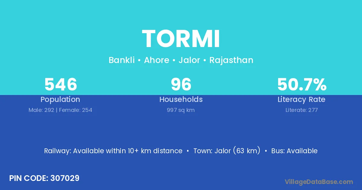 Jalor (63 km) is the nearest town to Tormi village for major economic activities and is located approximately 63 km away.