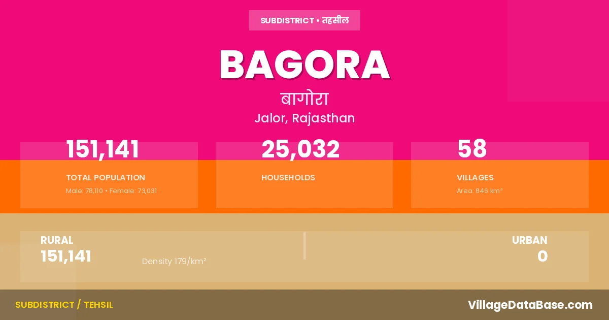 According to the 2011 census The total area of Bagora Tehsil is 846 km², with a population of 151141 people. The population density is 179 inhabitants per square kilometre, and there are approximately 25032 houses in the sub district.
