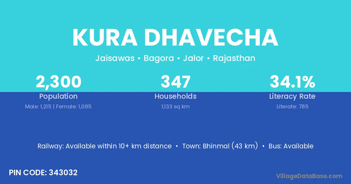 Bhinmal (43 km) is the nearest town to Kura Dhavecha village for major economic activities and is located approximately 43 km away.