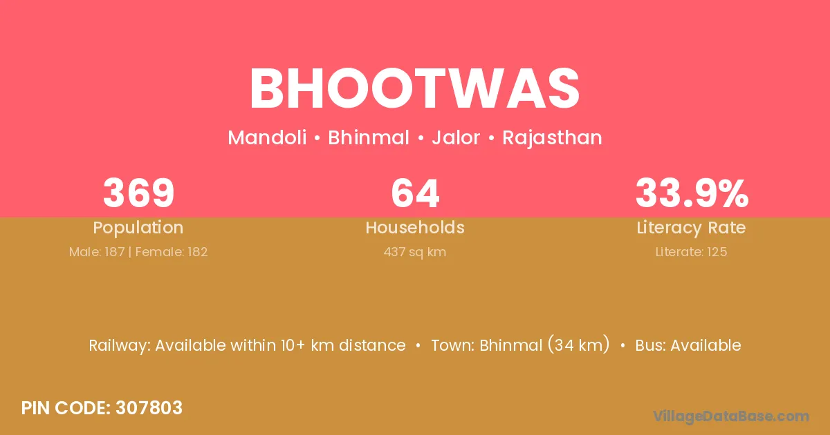 Bhinmal (34 km) is the nearest town to Bhootwas village for major economic activities and is located approximately 34 km away.