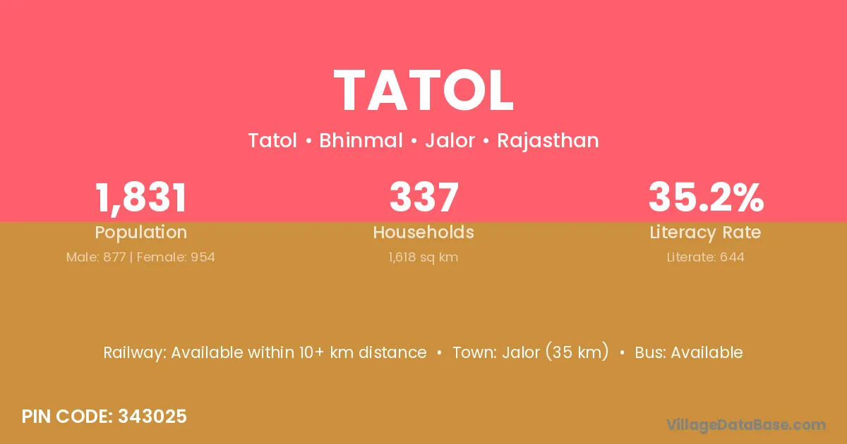Jalor (35 km) is the nearest town to Tatol village for major economic activities and is located approximately 35 km away.