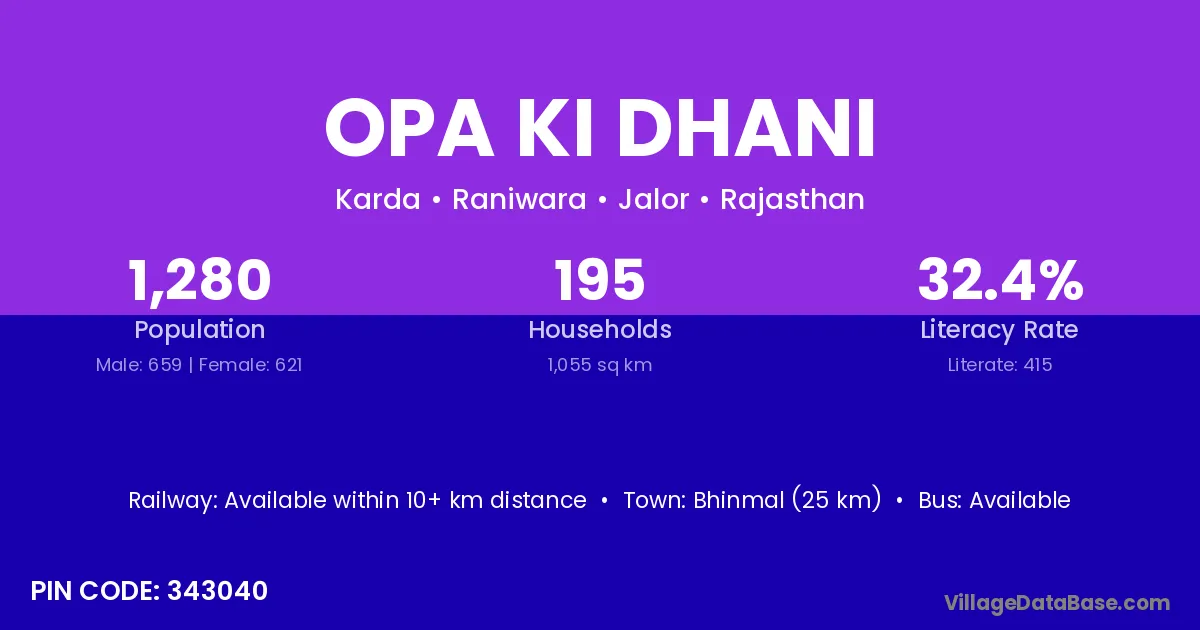 Opa Ki Dhani village has a total population of 1,280 people, of which 659 are males and 621 are females.