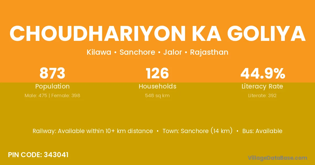Sanchore (14 km) is the nearest town to Choudhariyon Ka Goliya village for major economic activities and is located approximately 14 km away.