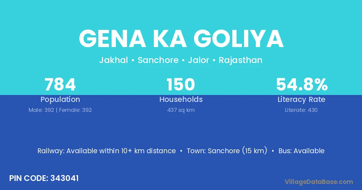 Gena Ka Goliya village has a total population of 784 people, of which 392 are males and 392 are females.