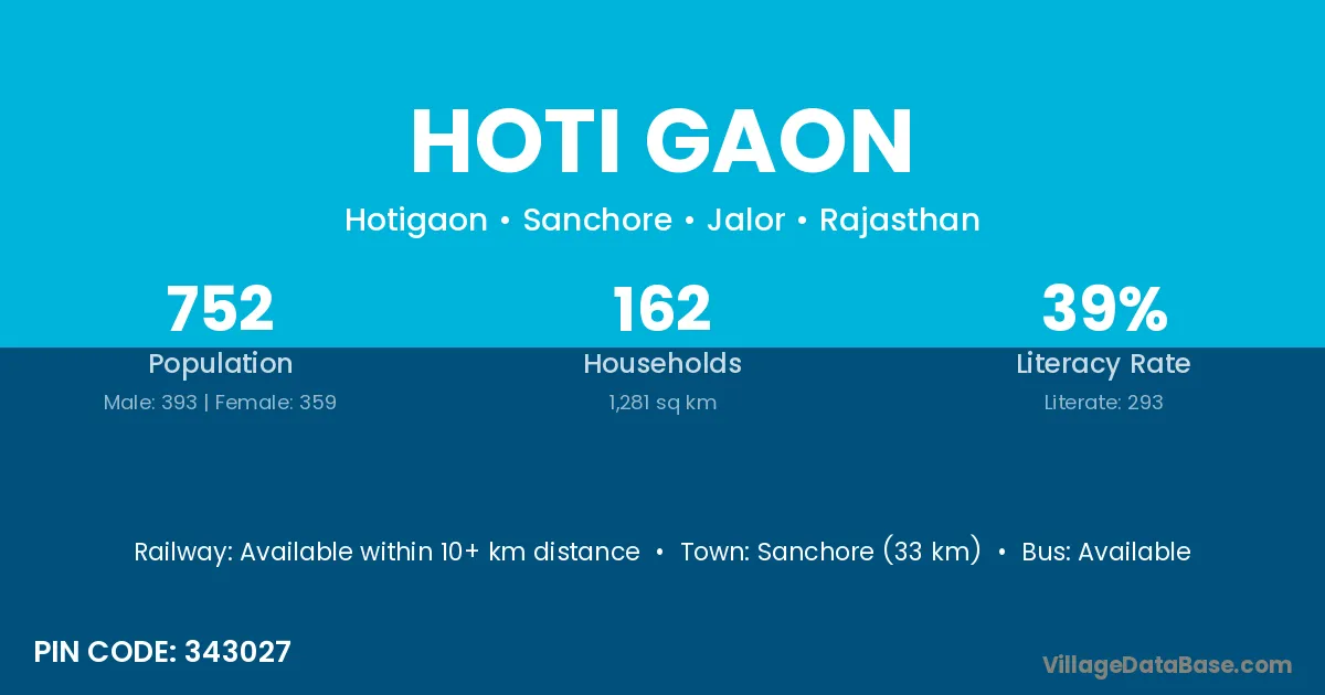 Sanchore (33 km) is the nearest town to Hoti Gaon village for major economic activities and is located approximately 33 km away.
