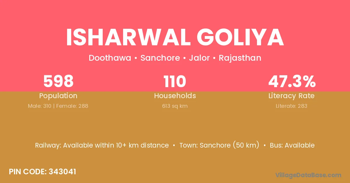 Sanchore (50 km) is the nearest town to Isharwal Goliya village for major economic activities and is located approximately 50 km away.