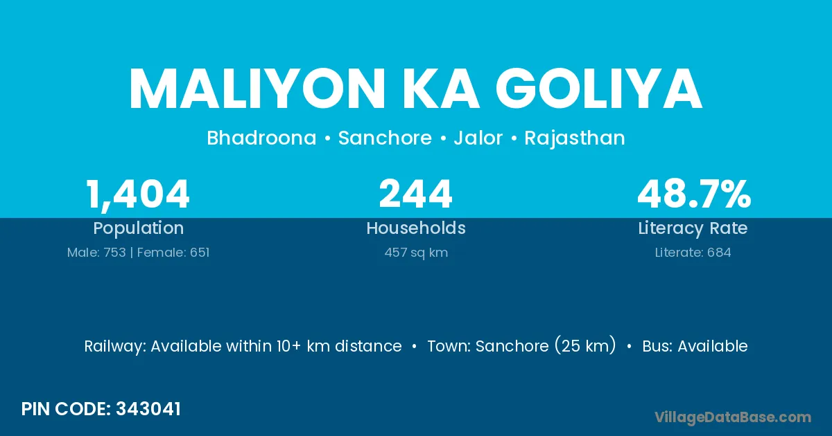 Sanchore (25 km) is the nearest town to Maliyon Ka Goliya village for major economic activities and is located approximately 25 km away.