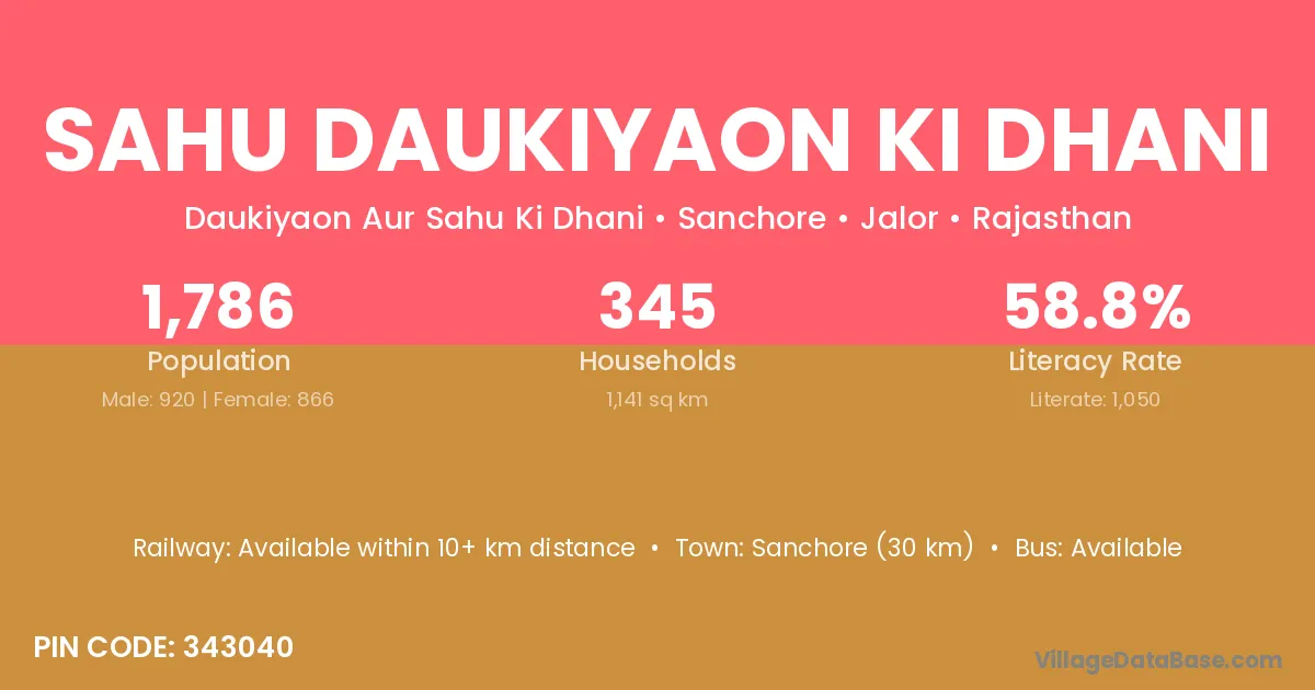 Sanchore (30 km) is the nearest town to Sahu Daukiyaon Ki Dhani village for major economic activities and is located approximately 30 km away.