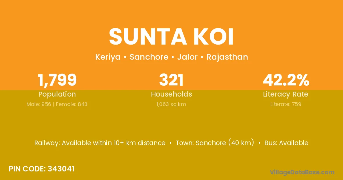 Sanchore (40 km) is the nearest town to Sunta Koi village for major economic activities and is located approximately 40 km away.