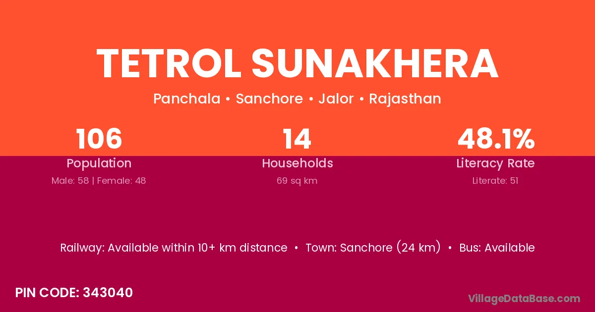 Tetrol Sunakhera village has a total population of 106 people, of which 58 are males and 48 are females.