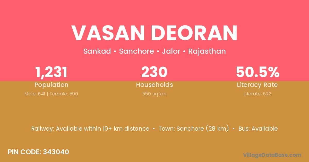 Sanchore (28 km) is the nearest town to Vasan Deoran village for major economic activities and is located approximately 28 km away.
