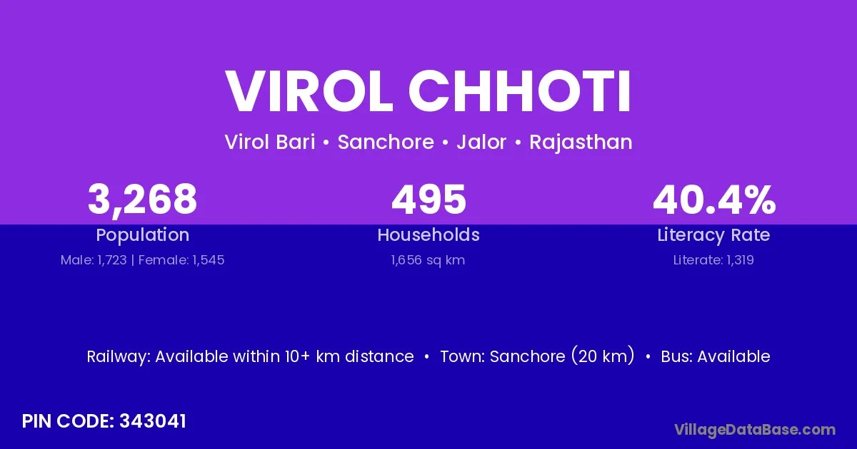 Sanchore (20 km) is the nearest town to Virol Chhoti village for major economic activities and is located approximately 20 km away.