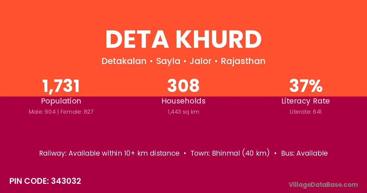 Bhinmal (40 km) is the nearest town to Deta Khurd village for major economic activities and is located approximately 40 km away.