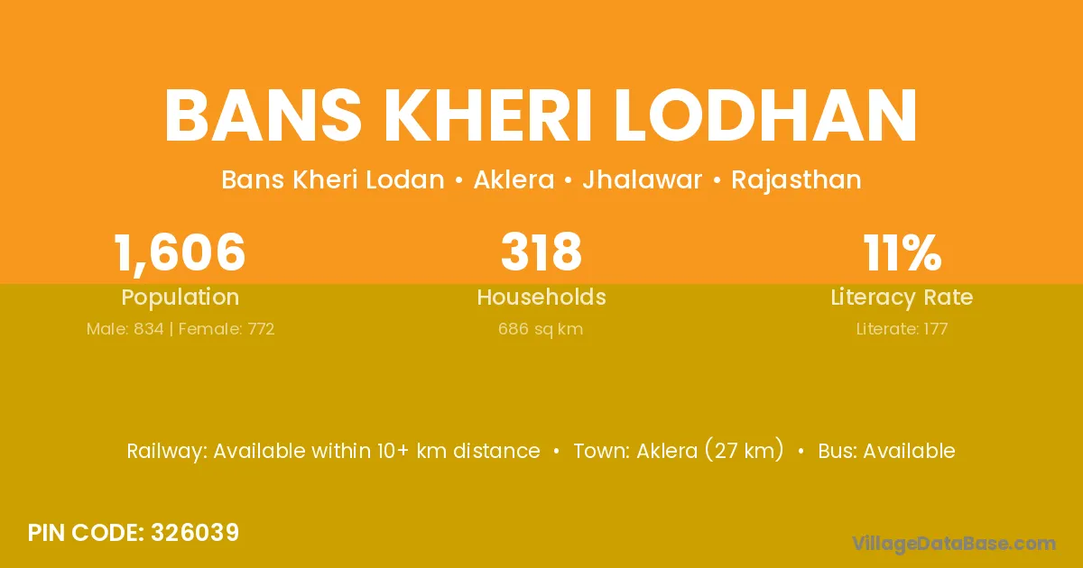 Aklera (27 km) is the nearest town to Bans Kheri Lodhan village for major economic activities and is located approximately 27 km away.