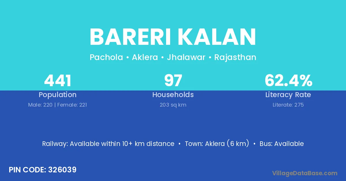 Aklera (6 km) is the nearest town to Bareri Kalan village for major economic activities and is located approximately 6 km away.