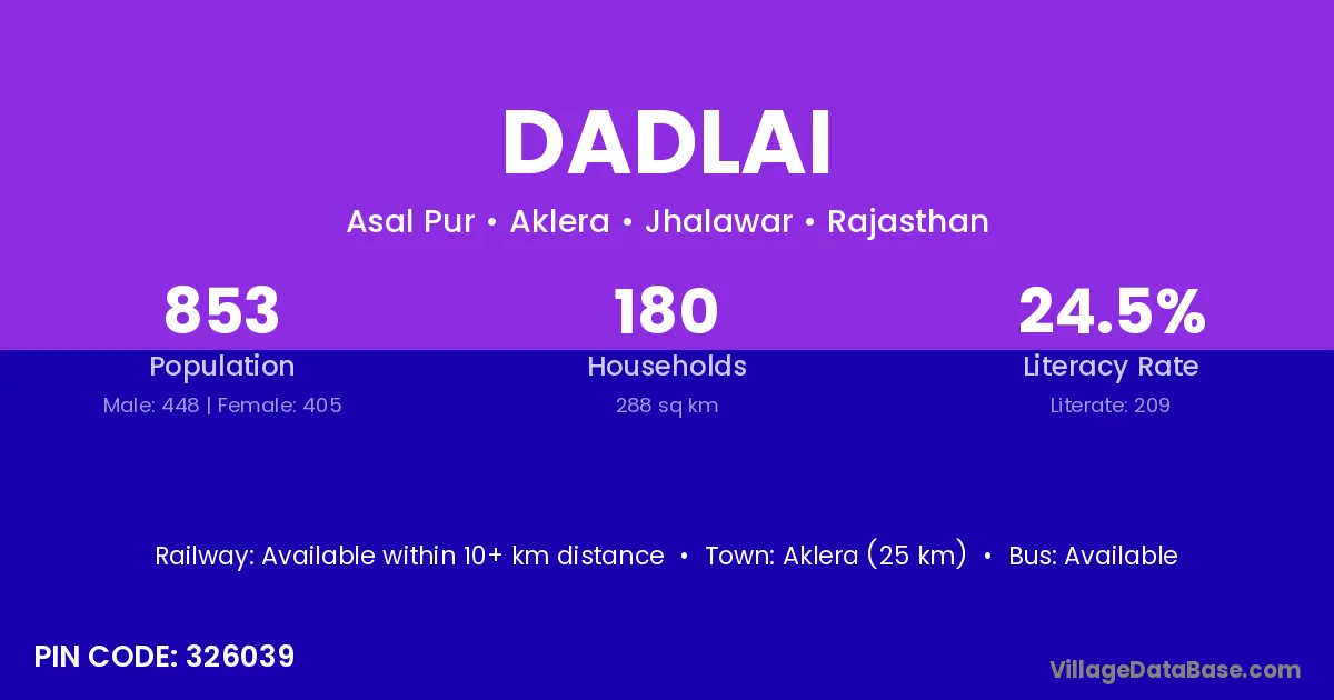 Aklera (25 km) is the nearest town to Dadlai village for major economic activities and is located approximately 25 km away.