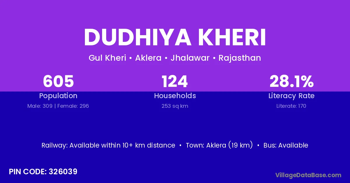 Aklera (19 km) is the nearest town to Dudhiya Kheri village for major economic activities and is located approximately 19 km away.