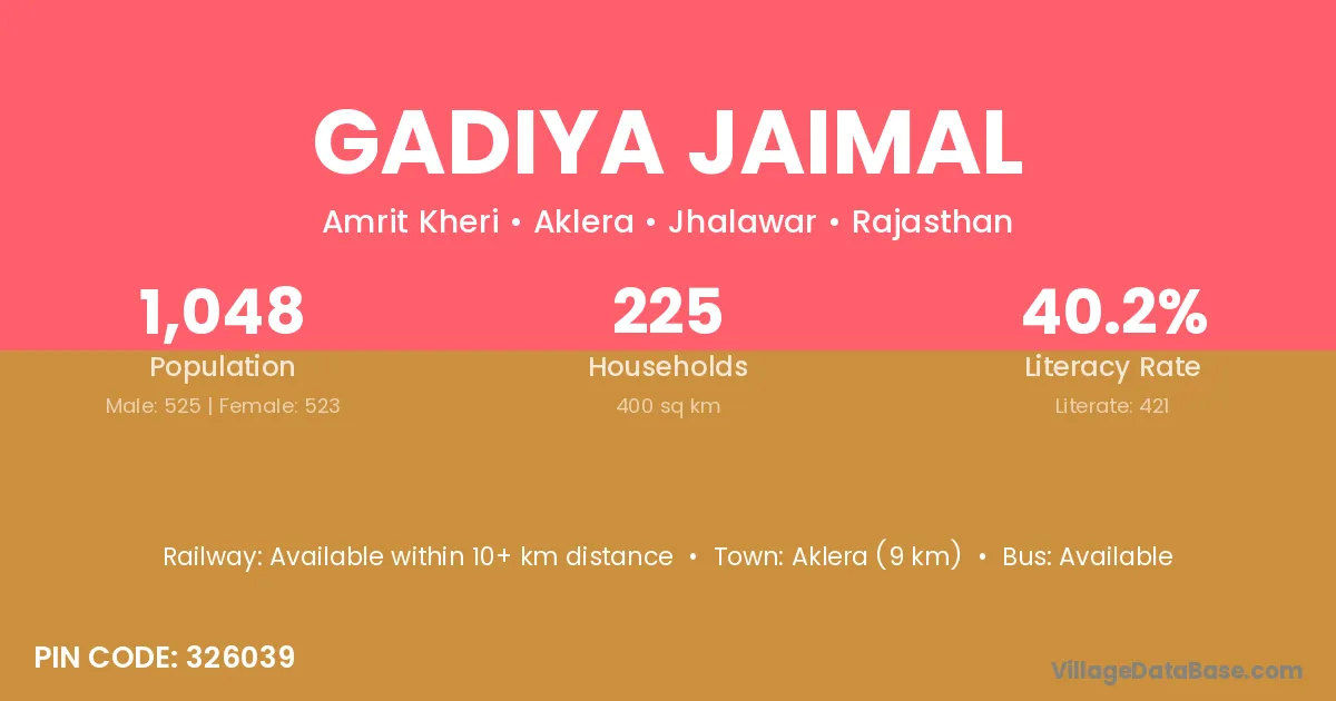 Aklera (9 km) is the nearest town to Gadiya Jaimal village for major economic activities and is located approximately 9 km away.