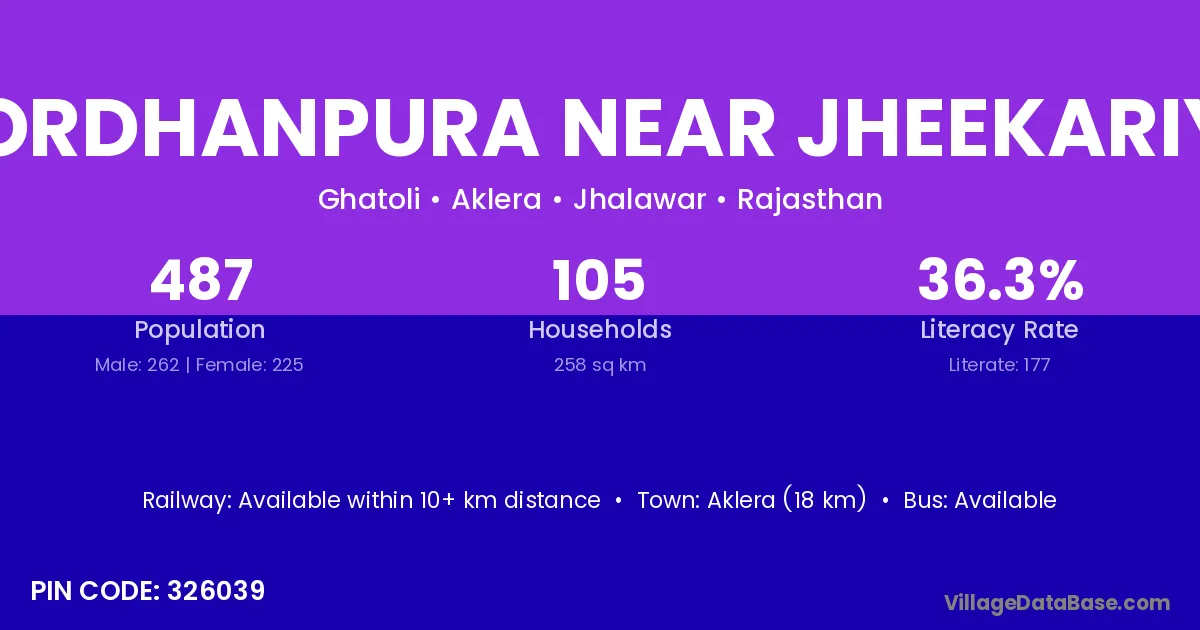 Gordhanpura Near Jheekariya village has a total population of 487 people, of which 262 are males and 225 are females.